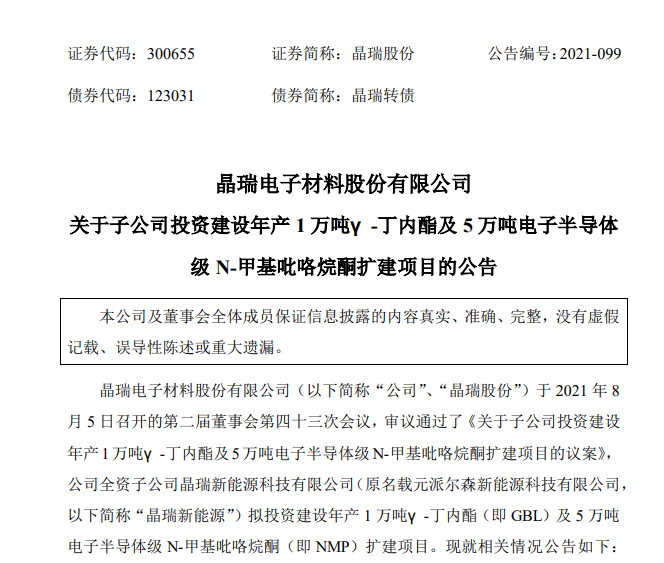 8月5日晚間,晶瑞股份發(fā)布關于全資子公司晶瑞新能源科技有限公司(以下簡稱“晶瑞新能源”)擬投資建設年產1萬噸γ-丁內酯(即GBL)及5萬噸電子半導體級N-甲基吡咯烷酮(即NMP)擴建項目的公告。