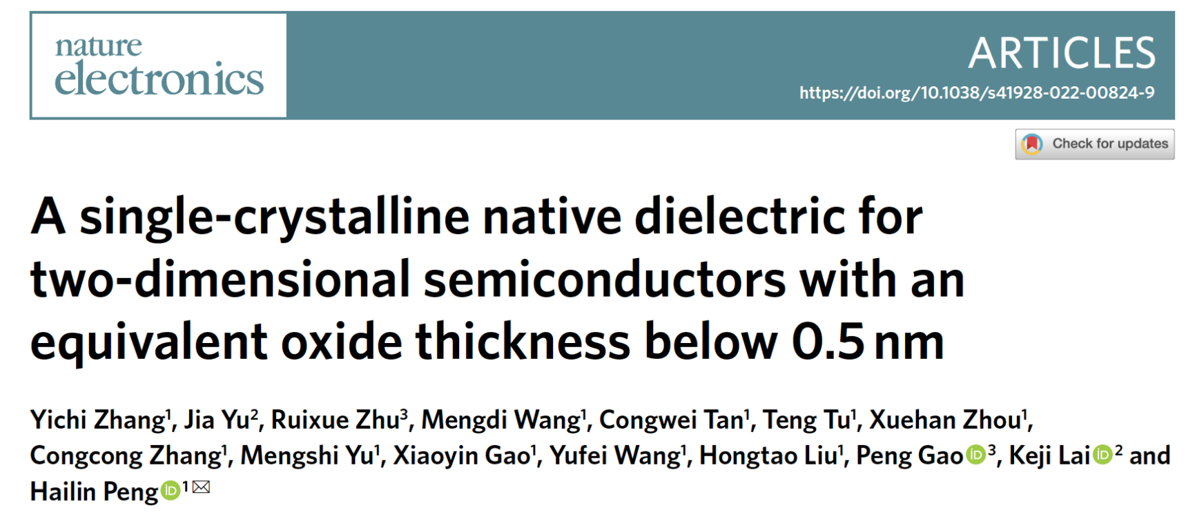 該研究成果于2022年9月15日在線發(fā)表在《自然-電子學(xué)》(Nature Electronics 2022, https://doi.org/10.1038/s41928-022-00824-9)。北京大學(xué)化學(xué)與分子工程學(xué)院彭海琳教授為該論文的通訊作者,第一作者為北京大學(xué)化學(xué)與分子工程學(xué)院博士研究生張亦弛。其他主要合作者還包括德州大學(xué)奧斯汀分校物理系賴柯吉教授、北京大學(xué)物理學(xué)院高鵬教授等。Nature Electronics期刊每期會挑選論文邀請作者撰寫研究簡介(Research Briefing),與研究論文同期在線刊出,方便讀者更好地理解重要成果。彭海琳教授和張亦弛同學(xué)代表論文作者發(fā)表了題為“Producing ultrathin monocrystalline native oxide dielectrics f2D transistors(為二維晶體管制備超薄單晶自然氧化物介電層)”的研究簡介,簡要介紹了此項研究的背景、過程、發(fā)現(xiàn)和意義。