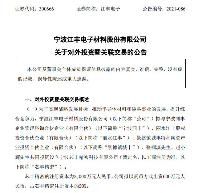 8月19日,寧波江豐電子材料股份有限公司(以下簡稱“江豐電子”)發布公告稱,為了實現戰略發展目標,推動半導體材料和裝備事業的發展,提升綜合競爭力,公司擬與寧波同豐企業管理咨詢合伙企業(有限合伙)、麗水江豐股權投資合伙企業(有限合伙)、景德鎮城豐特種陶瓷產業投資合伙企業(有限合伙)、張桐濱先生、趙小輝先生共同投資設立寧波芯豐精密科技有限公司(以下簡稱“芯豐精密”)。