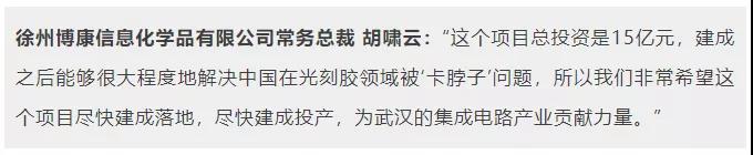 “武漢廣播電視臺”發文稱,徐州博康信息化學品有限公司常務總裁胡嘯云透露,這個項目總投資是15億元,建成之后能夠很大程度地解決中國在光刻膠領域被“卡脖子”問題,所以我們非常希望這個項目盡快建成落地,盡快建成投產,為武漢的集成電路產業貢獻力量。