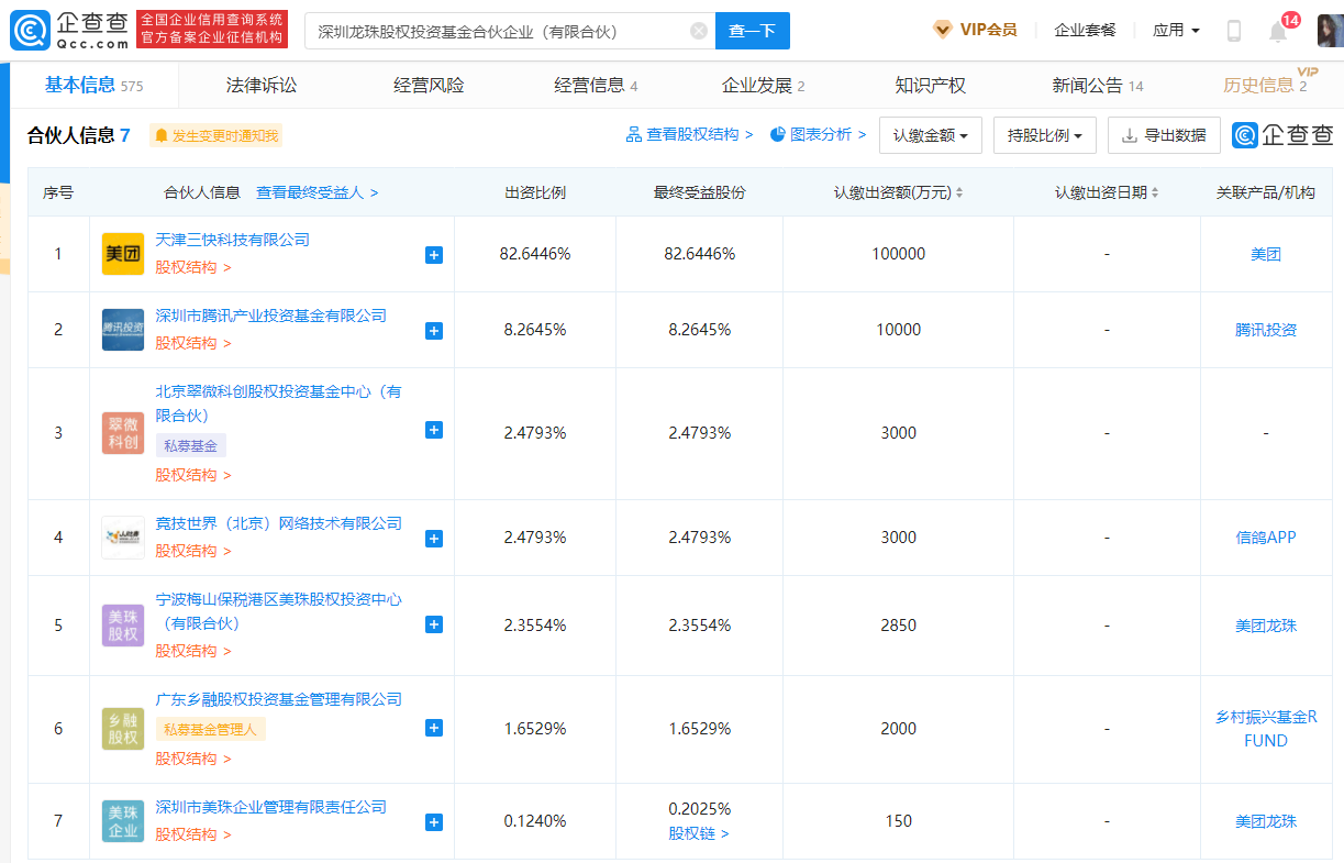值得注意的是,合伙人信息顯示,深圳龍珠投資的合伙人包括美團關聯公司天津三快科技有限公司(以下簡稱“天津三快科技”)、深圳市騰訊產業投資基金有限公司等,其中天津三快科技持股比例超82.65%。另外,北京酷訊科技由西瓜有限公司持股100%,而后者100%持股深圳美團科技有限公司等。