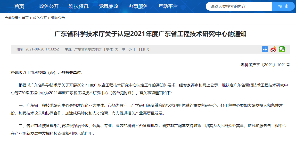 近日,廣東省科學(xué)技術(shù)廳發(fā)布關(guān)于認(rèn)定2021年度廣東省工程技術(shù)研究中心的通知。