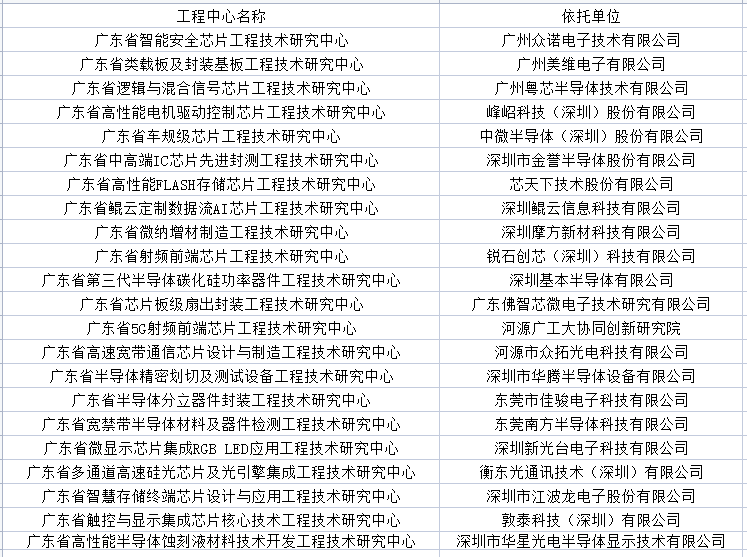 例如:廣東省車規(guī)級芯片工程技術(shù)研究中心,依托單位為中微半導(dǎo)體(深圳)股份有限公司;廣東省中高端IC芯片先進(jìn)封測工程技術(shù)研究中心,依托單位為深圳市金譽(yù)半導(dǎo)體股份有限公司;廣東省高性能FLASH存儲芯片工程技術(shù)研究中心,依托單位為芯天下技術(shù)股份有限公司;廣東省鯤云定制數(shù)據(jù)流AI芯片工程技術(shù)研究中心,依托單位為深圳鯤云信息科技有限公司;廣東省5G射頻前端芯片工程技術(shù)研究中心,依托單位為河源廣工大協(xié)同創(chuàng)新研究院;廣東省第三代半導(dǎo)體碳化硅功率器件工程技術(shù)研究中心,依托單位為深圳基本半導(dǎo)體有限公司;廣東省半導(dǎo)體分立器件封裝工程技術(shù)研究中心,依托單位為東莞市佳駿電子科技有限公司。