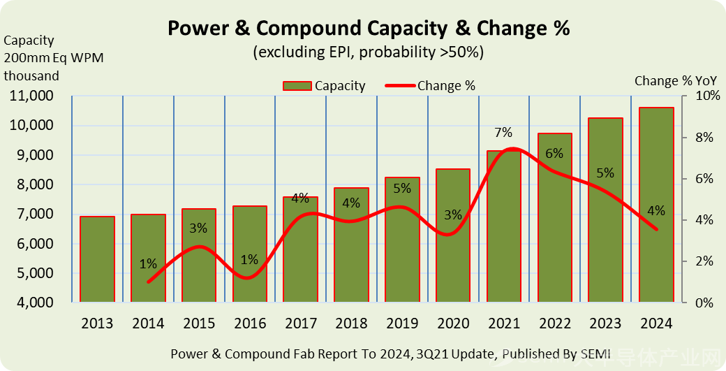 2019年,功率和化合物半導體fab廠的產能同比增長5%(YOY),2020年增長3%,2021年增長7%。預計2022年和2023年的增長率將分別保持在6%和5%的強勁水平,2023年時達到1000萬WPM的記錄。