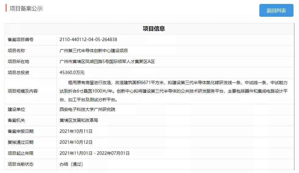 據披露,廣州第三代半導體創新中心建設項目已于10月12日復核通過,并將于2021年11月開建,2022年7月結束。