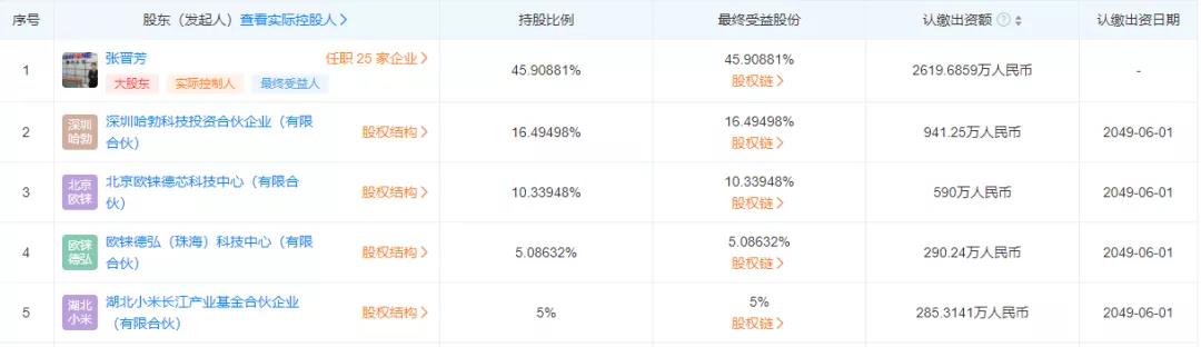 工商信息顯示,目前,深圳哈勃已經成為歐錸德微電子的第二大股東,持股16.49%,小米長江產業基金則為第五大股東,持股比例5%,而張晉芳的股權比例則有小幅下降,從此前的50.9%下降至45.91%。