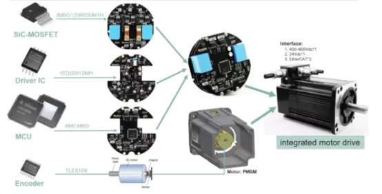 基于SiC的功率半導體器件可在高溫、高壓、高頻、強輻射等極端環(huán)境下工作,性能優(yōu)勢突出,將其應用于電機驅動領域,不僅可降低驅動器的體積、重量、損耗,提升功率密度,還能有效減少音頻噪聲并提升電機響應性能,這對于我國突破高端伺服電機技術和實現(xiàn)高性能伺服電機及驅動器國產(chǎn)化具有重要意義。邁信電氣與英飛凌合作開發(fā)了基于SiC-MOSFET自然散熱設計的一體化伺服電機系統(tǒng),其功率板選用6顆30mΩ-SMD封裝的CoolSiCTM MOSFET,具有較低的導通損耗、開關損耗、優(yōu)異的開關速度可控性和散熱性能。